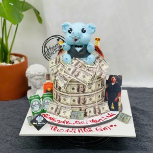 Bánh sinh nhật trang trí tiền đôla và con heo nhỏ đáng yêu tặng nam