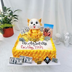 Bánh kem sinh nhật vẽ hình con mèo tuổi mẹo và đồng tiền vàng tặng nữ