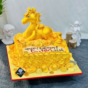 Bánh sinh nhật tạo hình 3d con ngựa tuổi ngọ mạ vàng độc đáo tặng ông xã