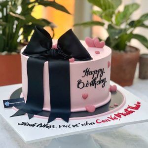 Bánh sinh nhật trang trí chiếc nơ màu đen nền hồng đáng yêu tặng vợ