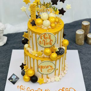 Bánh sinh nhật trang trí quả châu mạ vàng 2 tầng sang trọng tặng bé trai