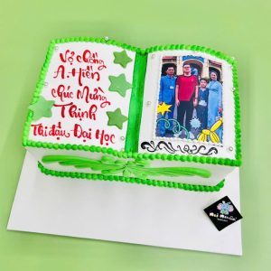 Bánh sinh nhật tạo hình 3d quyển sách in hình đẹp mắt viền xanh lá