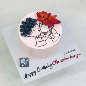 Bánh sinh nhật vẽ hình mặt chàng trai và cô gái tóc bằng trái cây đáng yêu