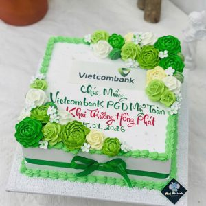 Bánh sinh nhật in hình logo vietcombank và hoa trà mừng khai trương