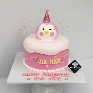 Bánh sinh nhật tạo hình 3d chú chim cánh cụt hồng siêu đáng yêu