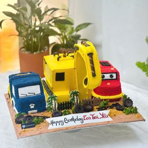 Bánh sinh nhật tạo hình 3d xe cẩu và 2 xe ô tô hoành tráng tặng con trai