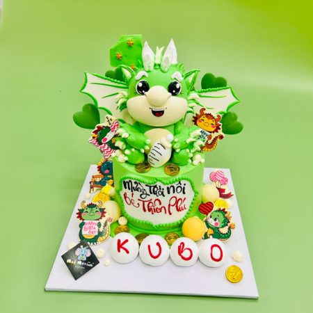 Bánh gato tạo hình 3d con rồng tuổi thìn màu xanh lá mừng thôi nôi