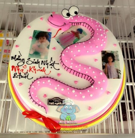Bánh kem 12 con giáp tuổi tỵ hình con rắn hoạt họa dễ thương, ngộ nghĩnh hình tròn màu trắng hồng vàng