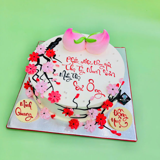 Bánh sinh nhật tạo hình 3d cành hoa đào và quả đào ý nghĩa mừng thọ ông