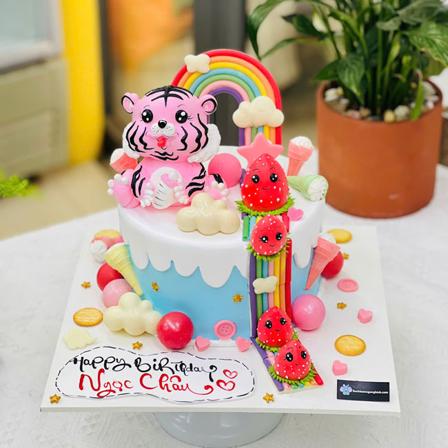 Bánh sinh nhật tạo hình 3d con hổ tuổi dần màu hồng và dâu tây đáng yêu