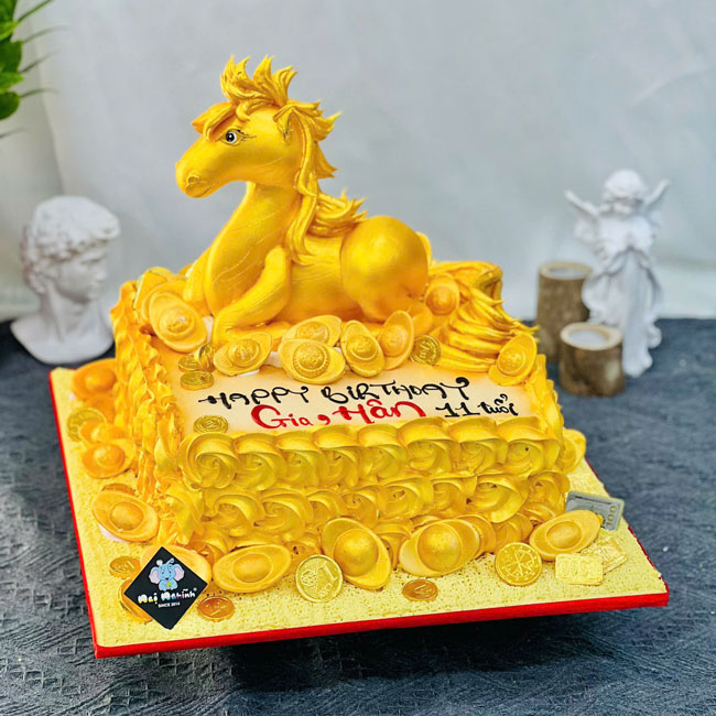 Bánh sinh nhật tạo hình 3d con ngựa tuổi ngọ mạ vàng đẹp độc đáo