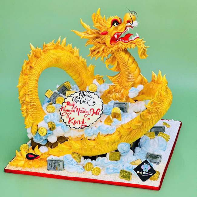 Bánh sinh nhật tạo hình 3d con rồng tuổi thìn mạ vàng siêu hoành tráng