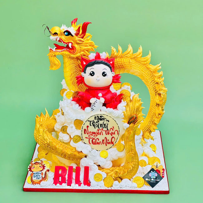 Bánh sinh nhật tạo hình 3d con rồng tuổi thìn mạ vàng vè bé trai đáng yêu