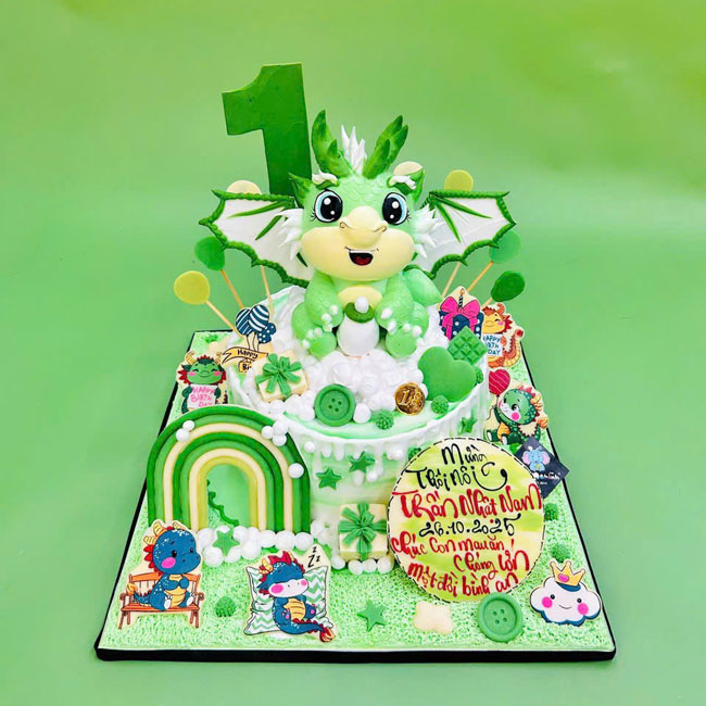 Bánh sinh nhật tạo hình 3d con rồng tuổi thìn màu xanh lá mừng thôi nôi