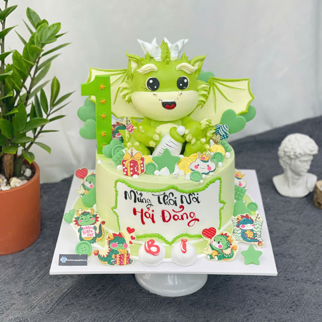 Bánh sinh nhật tạo hình 3d con rồng tuổi thìn màu xanh lá thôi nôi bé trai