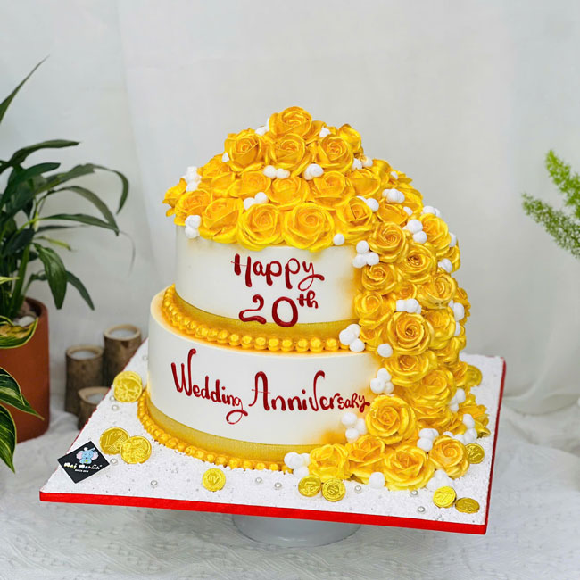 Bánh sinh nhật tạo hình 3d dải hoa hồng mạ vàng 2 tầng mừng kỷ niệm