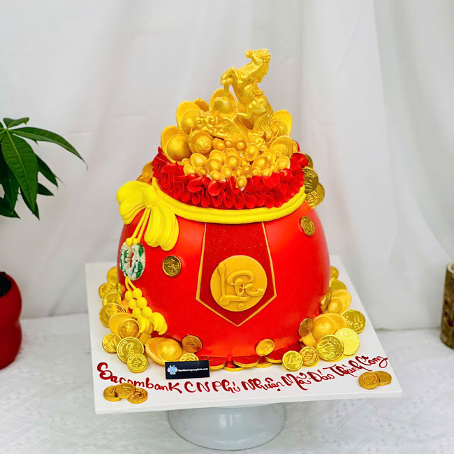 Bánh sinh nhật tạo hình 3d hủ vàng đỏ và ngựa vàng khai trương Sacombank