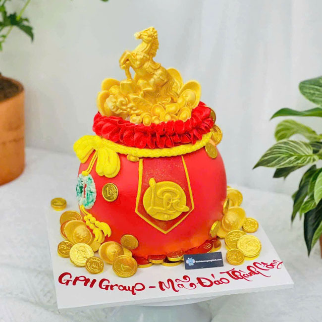 Bánh sinh nhật tạo hình 3d hủ vàng Lộc và ngựa vàng khai trương GPH Group