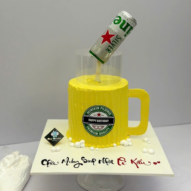 Bánh sinh nhật tạo hình 3d ly bia heineken màu vàng đẹp độc đáo