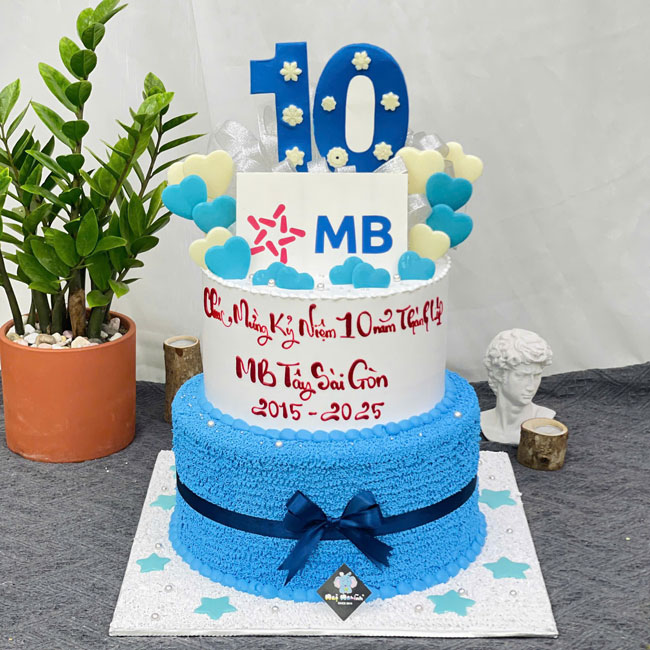 Bánh sinh nhật trang trí ảnh logo MB Bank 2 tầng sự kiện ngân hàng