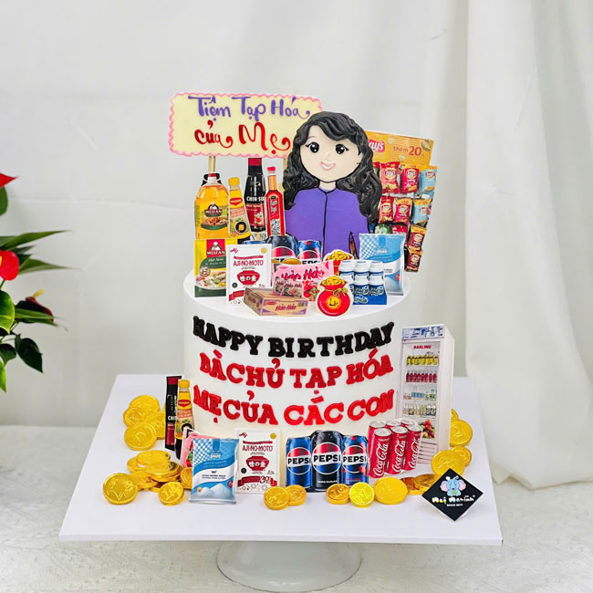 Bánh sinh nhật trang trí cô gái và tiệm tạp hóa siêu dễ thương tặng mẹ